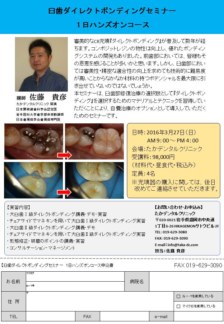 2016年3月27日(日)に開催します当クリニック主催のセミナーが満席になりました。誠にありがとうございます。4回目の今回は、ご要望のありましたマイクロ無しの臼歯ダイレクトボンディングハンズオンセミナーになります。今回も遠方よりお出での方々が多いですので、お気をつけて盛岡にいらしてください。