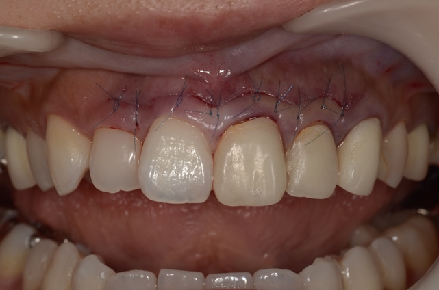 私、一応歯周病専門医でもあるので、歯肉、特に前歯の審美領域であればこのような瘢痕が出来ないように行いたい。笑っても決して見える位置ではないのですが、出来ることなら手術をしたことすら忘れてしまうような傷跡を残さない治療をしたいと常々思っており、その後現在に至るまで研鑽を積んでおります。