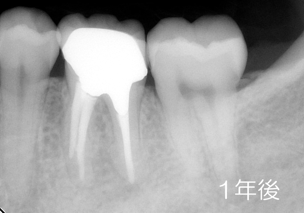 通法に従い診査をしたところ根の病気の症状を呈しており、かぶせ物の適合が悪いこと、レントゲン写真でも根の先に怪しい像が出ていましたので、根管治療を行うことにしました。
