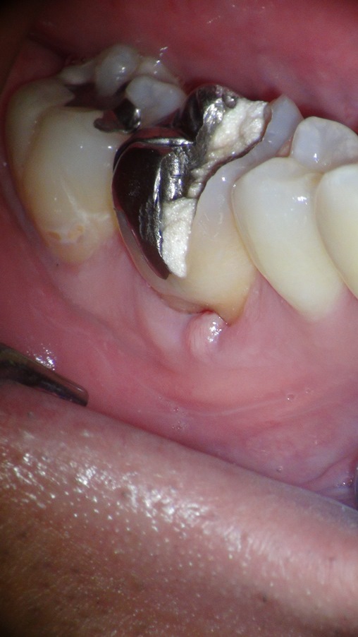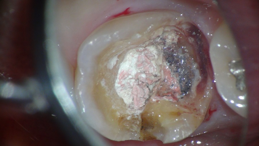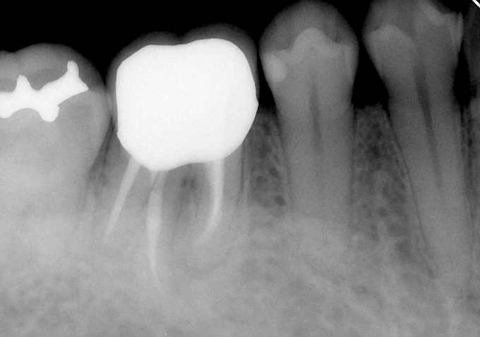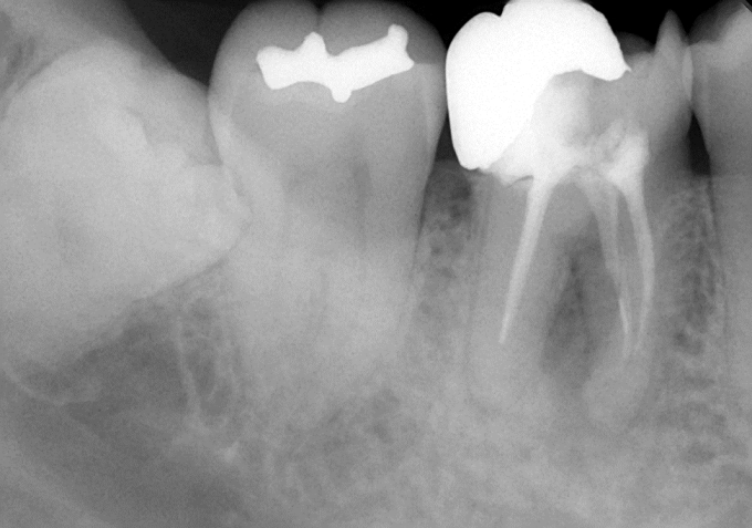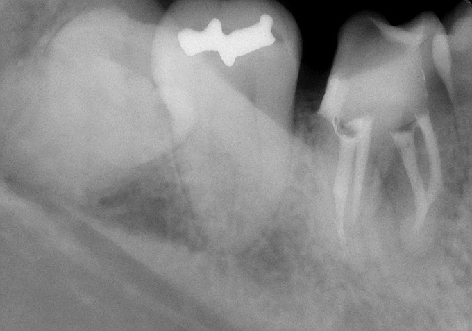 こちらの患者さんは、10年以上前に治療したところが、急に痛み出した、そして歯肉も腫れていると来院されました。お口の中を拝見させていただくと治療途中の歯が・・・。聞けば症状が出た後、地元の歯医者さんで2、3回治療をしたが回復の兆しがないことこれでダメなら抜歯!と言われたことからネットで調べて当クリニックを受診したとのこと。