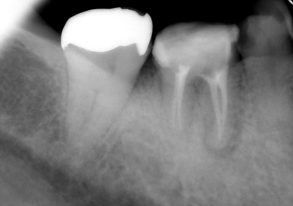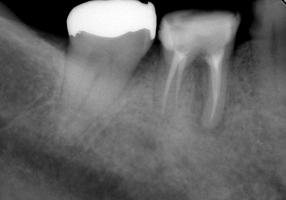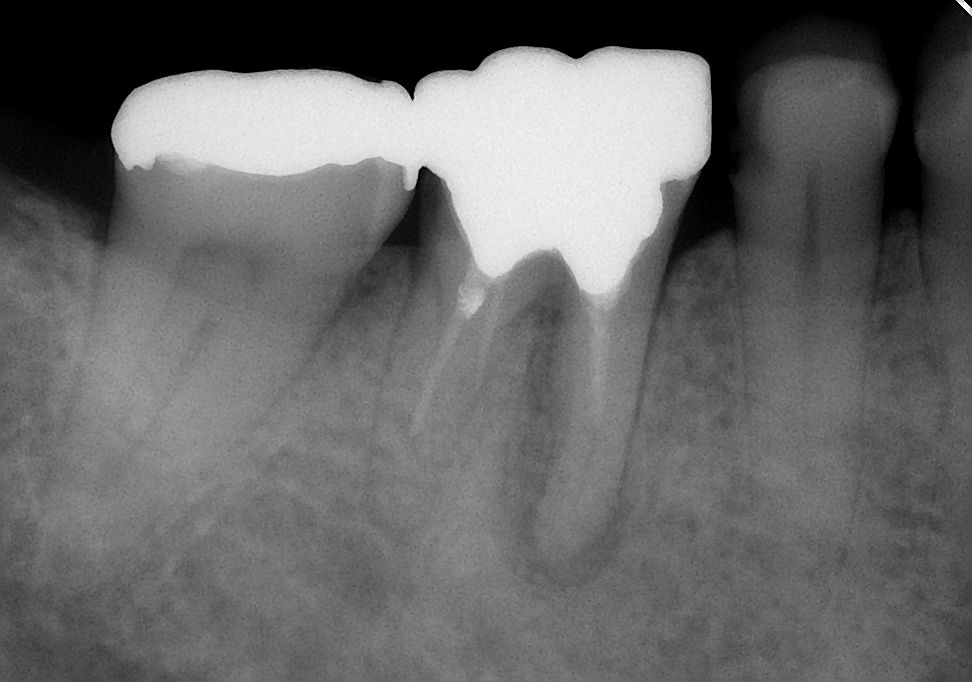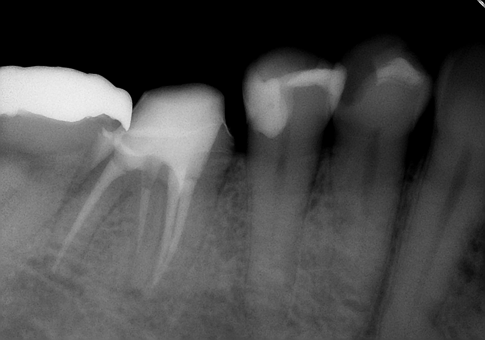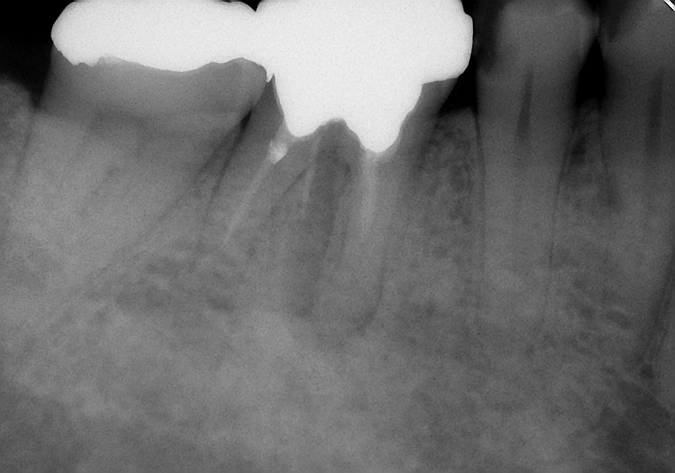 初診時は、時々歯肉から膿が出てきたり、鈍痛を感じることがあったとのこと。レントゲン写真を見ると確かに病気が出来ている影が・・・。さらに、この影の形を見るともしかしたら歯の根が割れているかもしれない。そうなると抜歯に移行しなければなくなる可能性もあることなど病気が治る喜びだけでなく、リスクや起こりうる可能性についても細かく説明させていただいた後に治療を開始しました。